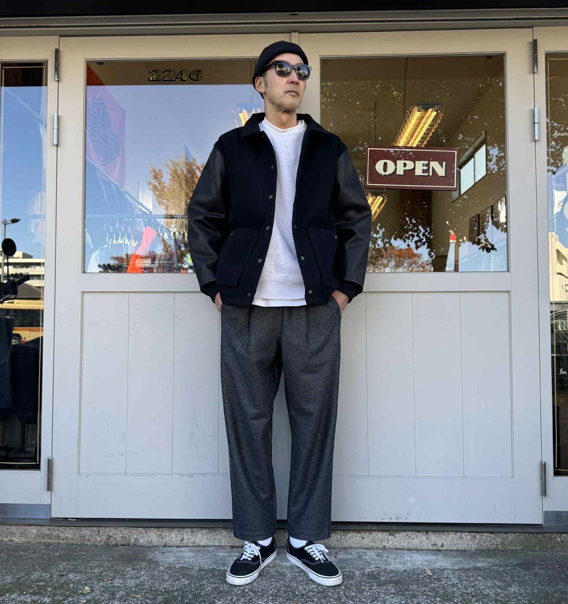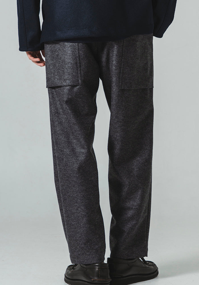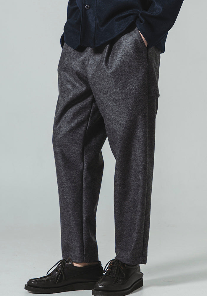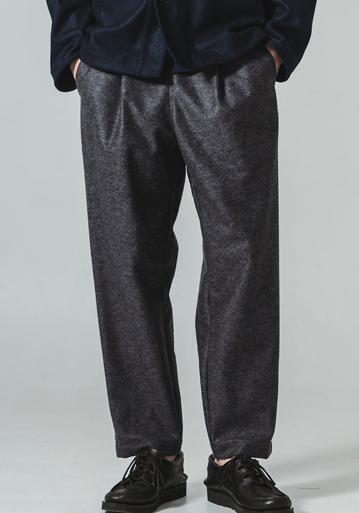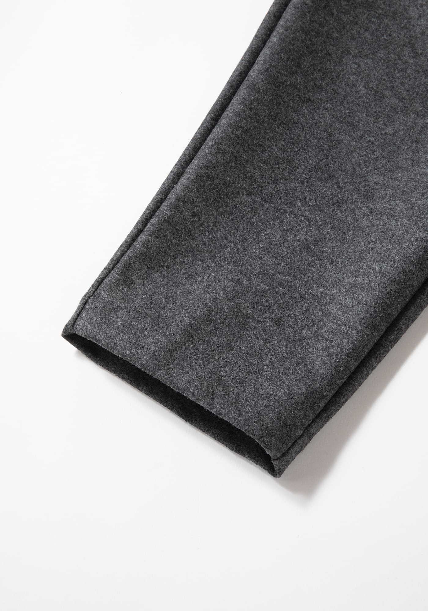 この糸で編み立てた素材はウールメルトンのようなハードな風合いと程よい柔らかさ、