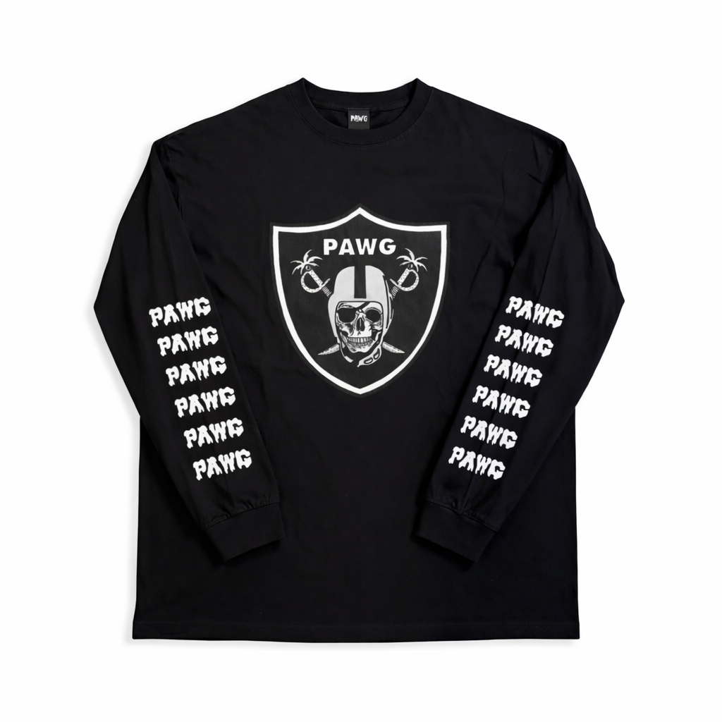 PAWGよりKennyが大好きなOakland のアメフトチームのデザインを🇺🇸の鬼才アーティストSeanに依頼パロディし袖にはPAWGのHorror Logo入りです。
